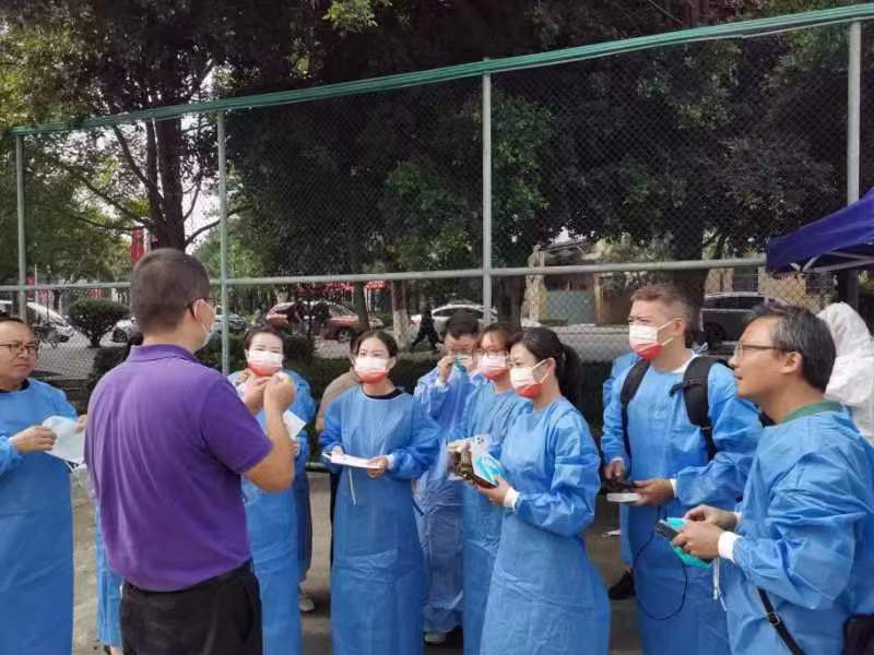 下午3时,学院12名党员志愿者老师在王斌、杨宏毅的带领下来到核酸检测现场。党委学生工作部李毅副部长统一分派工作后,志愿者们先做好自我防护,再有序来到分派岗位进行志愿服务工作。